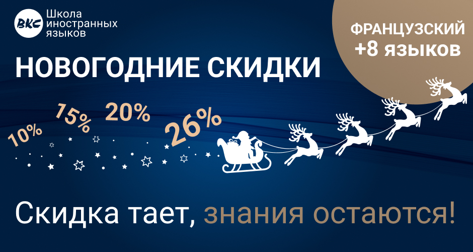 Мы приготовили настоящий новогодний сюрприз для всех, кто уже учит иностранные языки или только собирается начать – скидку до 26% на обучение французскому и другим языкам.
